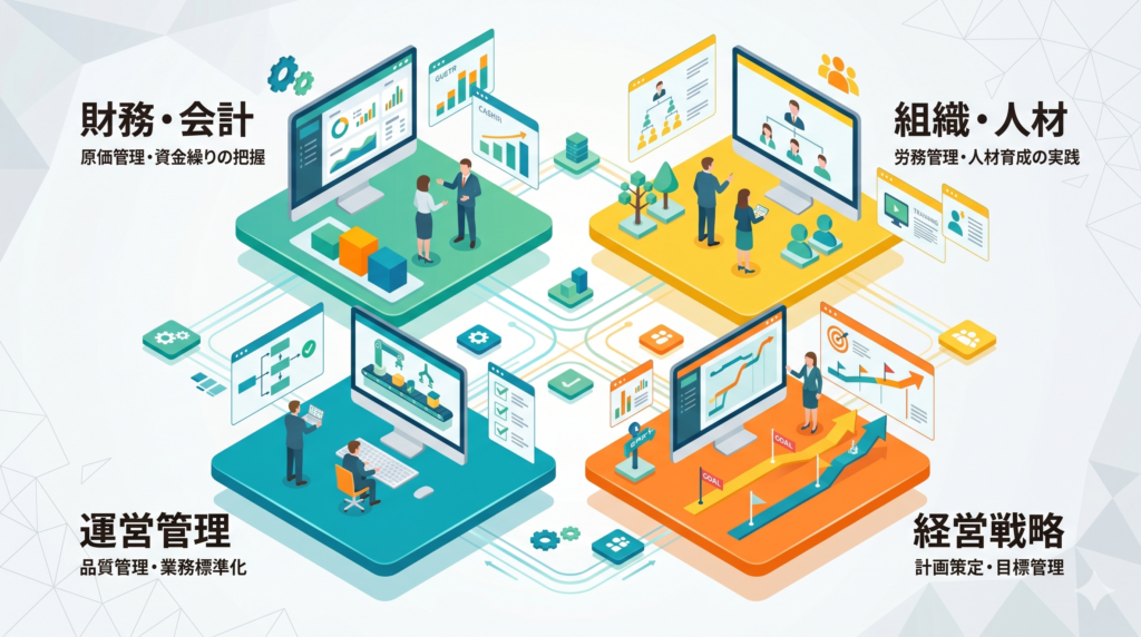 白書は、小規模事業者の経営リテラシーが十分とは言えない水準にある現状を指摘したうえで、その底上げが業績改善に直結することをデータで示しています。白書が定義する経営リテラシーは、以下の4分野に整理されます。
